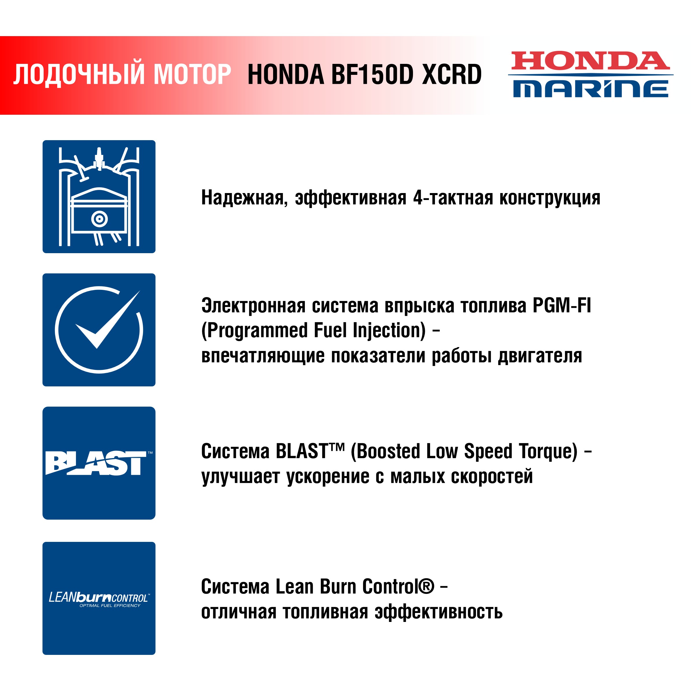 Основной технологической инновацией для нового мотора является передовая технология iST® (Intelligent Shift и Throttle®), позаимствованная у легендарных двигателей V6 от Honda, которая позволяет обеспечивать точный электронный отклик двигателя, а также позволяет владельцам управлять несколькими двигателями с помощью одного рычага, что обеспечивает удобство и простоту использования. BF150 также получил систему зажигания с иммобилайзером, для запуска которой требуется дистанционный транспондерный ключ. Иммобилайзер предотвращает несанкционированный запуск двигателя, который невозможен без наличия ключа-транспондера.
